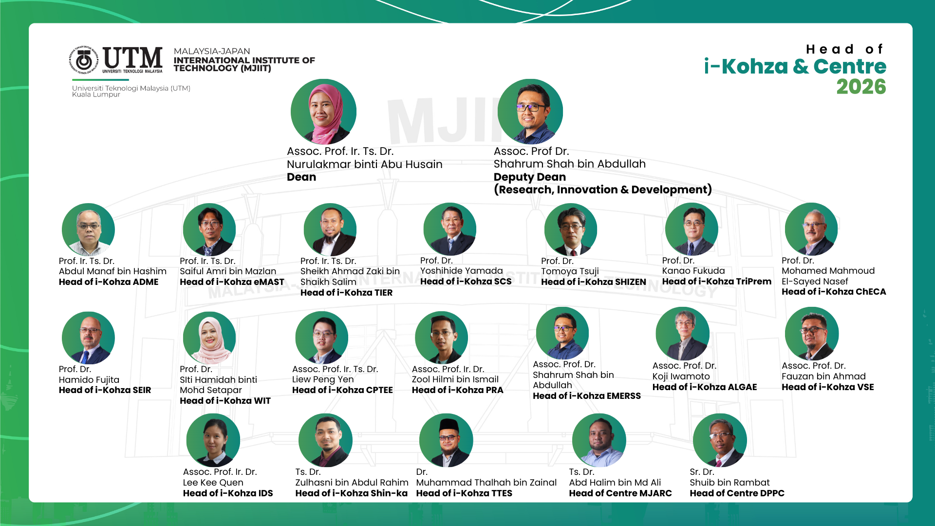 Research @ MJIIT is classified into several distinct groups of iKohzas. Unlike typical research groups, iKohzas at MJIIT are formal structures for collaborative research. Each is led by a senior academic with group members comprising academics and researchers of similar interests, and students as junior members.
