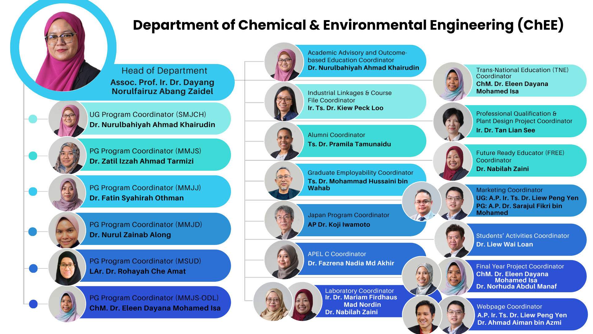 The Department of Chemical and Environmental Engineering (ChEE) serves the Bachelors and Master by Taught Course programmes under the department. The department formed with 40 full time academic member, who are mainly chemical engineering, environmental sciences and engineering, disaster management, remote sensing and urban design background with diverse research interests to serve the undergraduat and postgraduate programs offered by the department. Currently, the department has two (2) Japanese academicians and one (1) other international academicians. The department has nine (8) profesional engineer (PE/PEPC BEM) with eight (8) in chemical engineering branch and one (1) in civil engineering branch. The Japanese academics recruitment are done through Japanese Universities Consortium (JUC), according to qualification, performance, and department’s need.