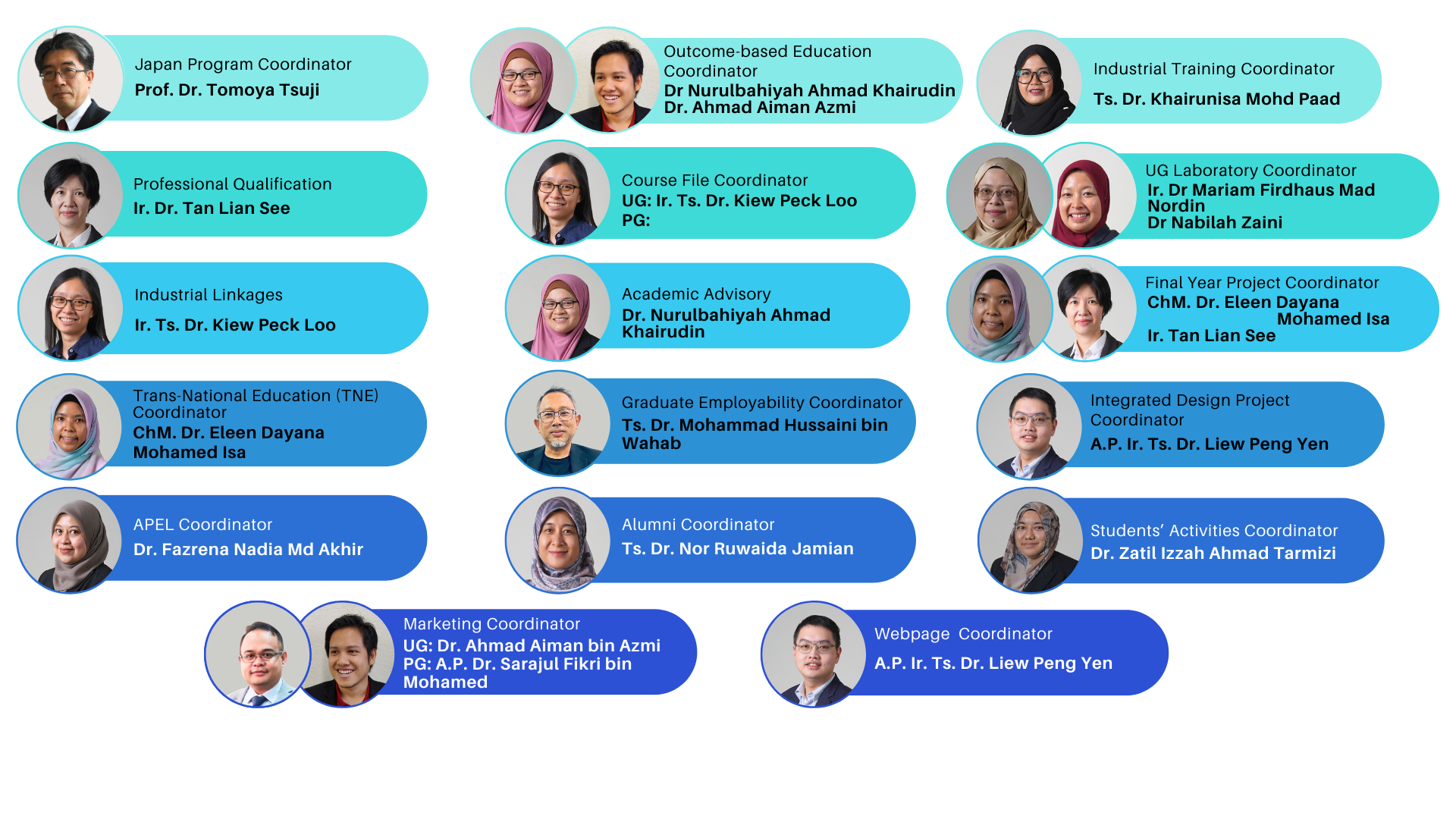 The Department of Chemical and Environmental Engineering (ChEE) offers Bachelor’s and Master’s programmes through Taught Courses. The department comprises 40 full-time academic members, mainly from chemical engineering, environmental sciences and engineering, disaster management, remote sensing, and urban design, with diverse research interests that support the department’s undergraduate and postgraduate programs. Currently, the department has two (2) Japanese academicians and one (1) other international academician. The department has eleven (11) professional engineers (PE/PEPC BEM), with eight (8) in the chemical engineering branch and three (3) in the civil engineering branch. Japanese academic recruitment is conducted through the Japanese Universities Consortium (JUC), based on qualifications, performance, and the department’s needs.