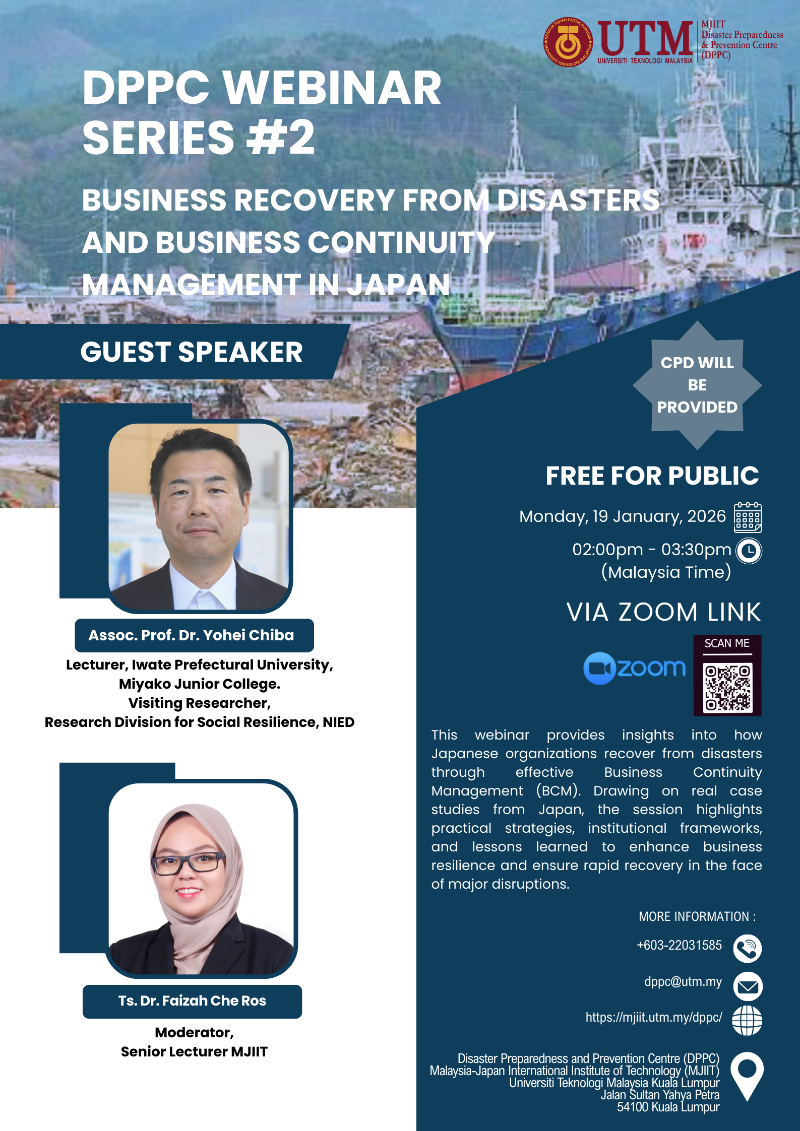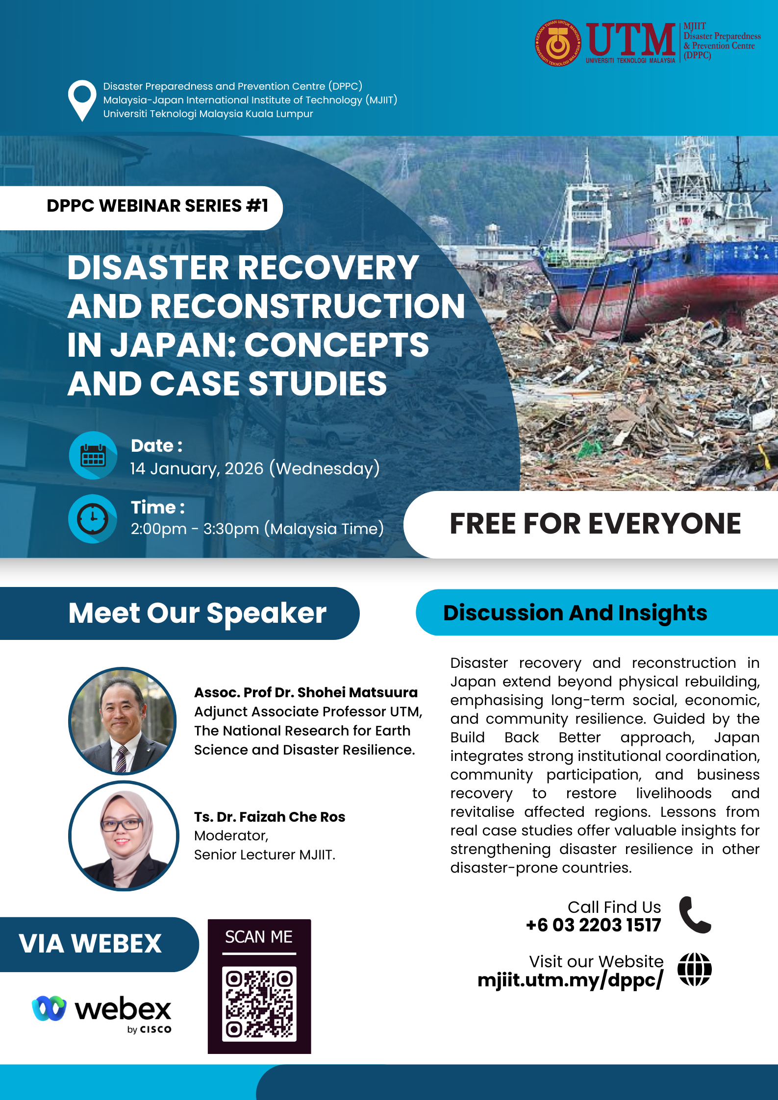 Join us for an insightful session with Assoc. Prof. Dr. Shohei Matsuura, Adjunct Associate Professor at UTM and Deputy Director General, International Affairs Division of Japan’s National Research Institute for Earth Science and Disaster Resilience. Moderated by Ts. Dr. Faizah Che Ros, this webinar explores Japan’s holistic approach to disaster recovery—beyond rebuilding, toward long-term resilience.