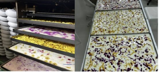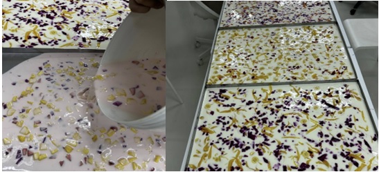 During the activity, yogurt-based snacks were prepared and decorated with a variety of fresh fruits, including banana, mango, jackfruit, pineapple, dragon fruit, and other locally sourced fruits. The prepared yogurt trays were then placed in the freeze-dryer, where the product underwent a controlled low-temperature dehydration process. Once fully dried, the final product became a light, crisp, and shelf-stable snack with concentrated flavour, demonstrating the potential of freeze-drying to enhance both product quality and stability.